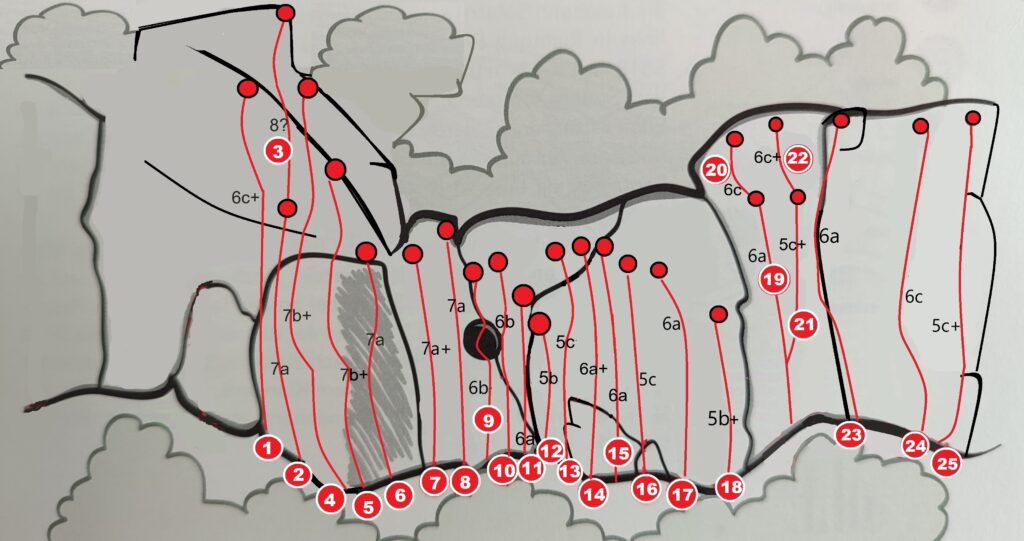 Grazie alla raccolta fondi, le prime 25 vie del settore destro della falesia sono già pronte per essere scalate! Sono state rivisitate e riattrezzate con fittoni e soste con doppio moschettone: i migliori materiali inox 316L. Stiamo continuando l’opera di chiodatura e richiodatura, ripulendo il sentiero e rifacendo la segnaletica. Ecco i tracciati delle ultime vie, con tutti i gradi aggiornati! A breve pubblicheremo le altre vie attualmente in cantiere. Restate connessi e se vi va continuate a sostenerci con la raccolta fondi qui: https://gofund.me/fc7d3258